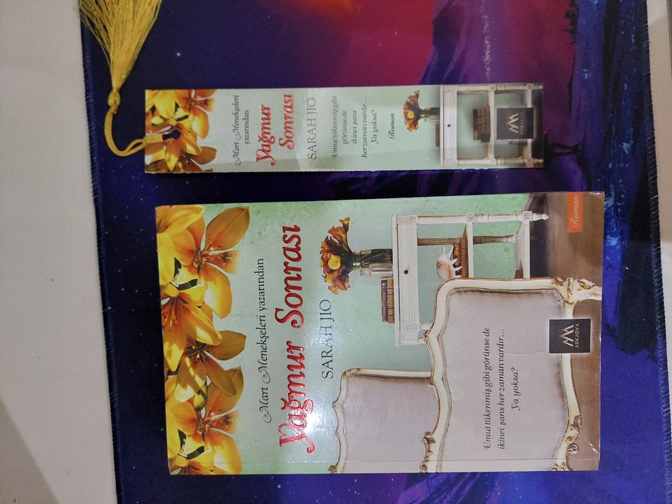 Sarah Jio'nun 'Yağmur Sonrası' adlı romanı, sarı çiçekler ve beyaz vintage bir masa ile sandalye görseli içeriyor. Duygusal ve anılarla dolu bir hikaye sunuyor.