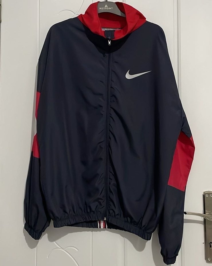 Kadında erkekte giyebilir. Yüksek yakalı, uzun kollu, bol kesim sentetik kumaştan yapılmış, fermuarlı kırmızı-siyah spor yağmurluk. Çok küçük bir kusura vardır fotoğraflarda çekilidir.