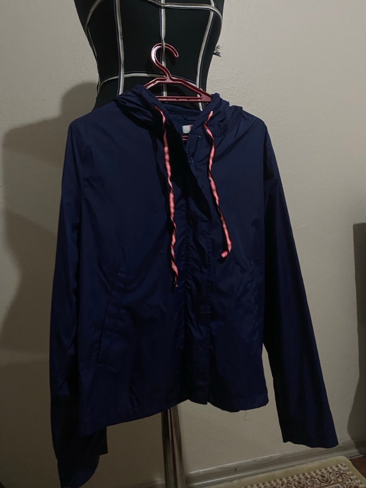 Koyu mavi kapüşonlu fermuarlı ceket, uzun kollu ve vücuda oturan kesime sahip. Dış mekan kullanımı için uygun, yumuşak sentetik kumaştan üretilmiştir. ️