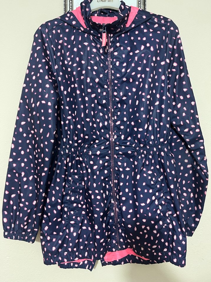 Koyu pembe tie-dye desenli, kapüşonlu yağmurluğu. Gevşek kesim, sentetik kumaştan, streetwear tarzında. ️
