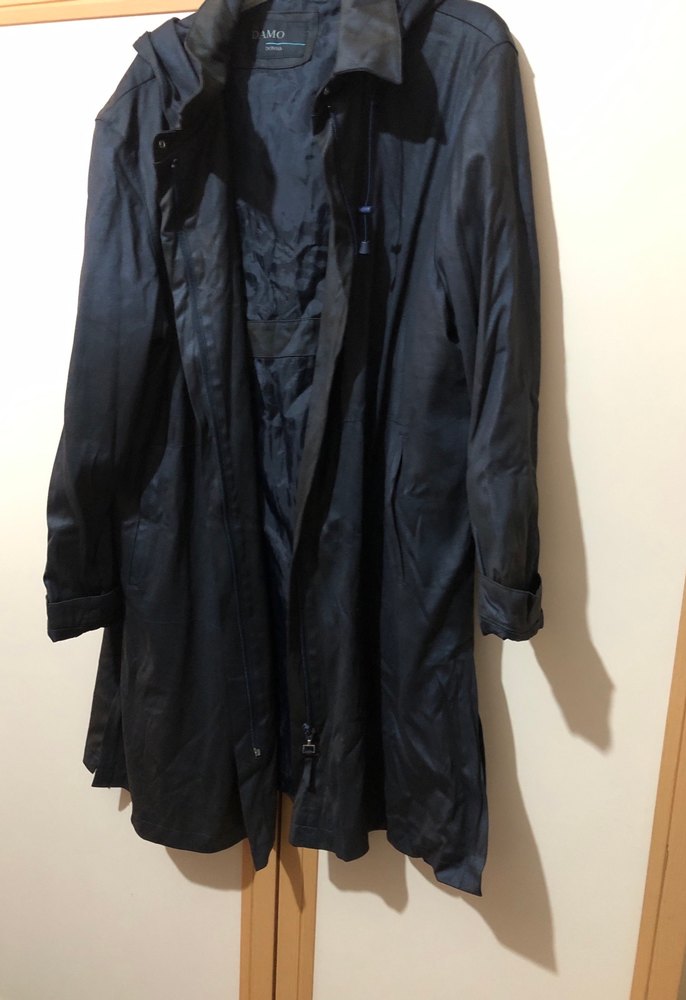 Düğmeli, siyah erkek trençkot, satenimsi kumaş, bol kesim ve notalı yaka ile. Uzun kollu, günlük sokak stili için uygun.