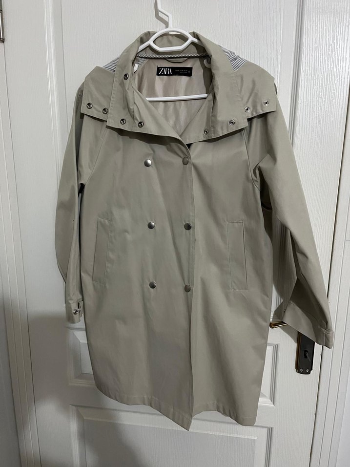 Bej midi uzunlukta, düğmeli ve cepli kadın yağmurluk Geniş kesimli, yakası notched lapel, uzun kollu ve düz desensiz, günlük kullanıma uygun.