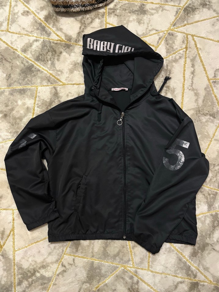 Siyah kapüşonlu, fermuarlı ve baskılı detaylara sahip bol kesim kadın yağmurluk.kolundaki sayıları çıktı
