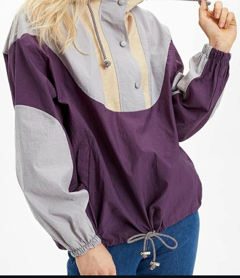 Hiç giyilmedi yıkanmadı bile alttan küçültme ipi olduğu için her bedene uyum sağlar Düğmeli, yüksek yakalı, mor ve gri renklerde, uzun kollu, bol kesim midi ceket. Belde büzgü ipi ve lastikli manşetler bulunur.