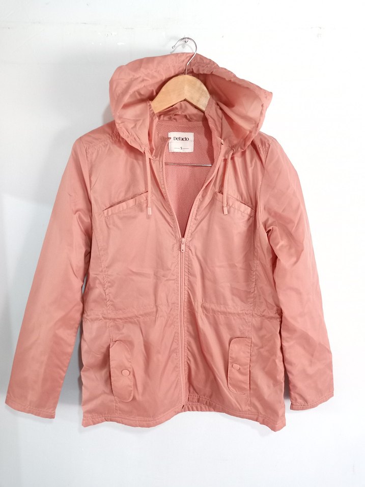 Gülpembe yağmurluk DeFacto boy 67 göğüs 50 Pastel pembe renkli kadın ceketi, kapüşonlu ve düğmeli ceplerle birlikte bol kesimdir. Sentetik kumaştan yapılmıştır ve dış mekan kullanımı için uygundur.