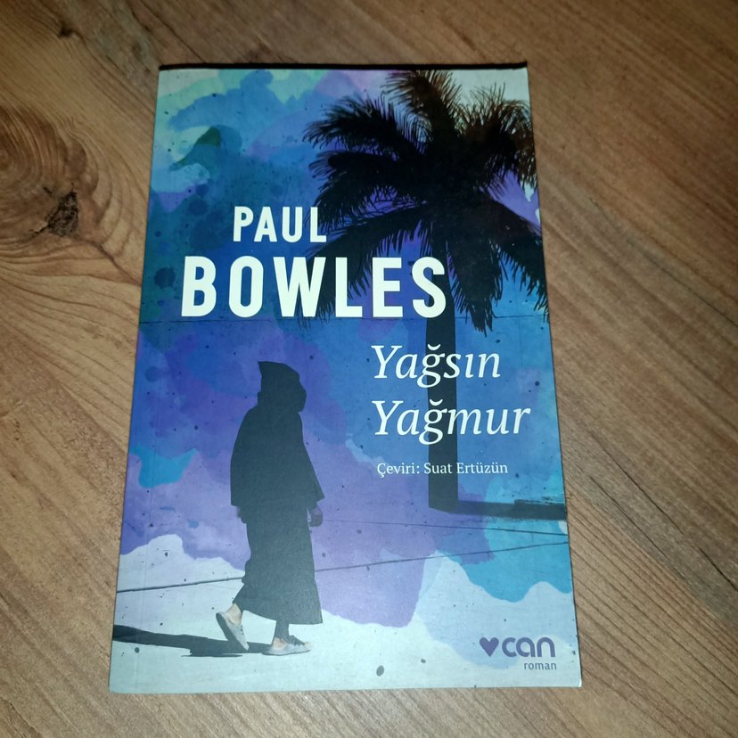Paul Bowles'ın 'Yağsın Yağmur' adlı romanı, Suat Ertüzün çevirisiyle Can yayınlarından. Kapakta palmiye ağacı altında siluet yer alıyor.