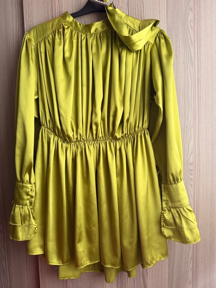 Yağyeşili renkli, parlak ve saten dokulu mini tunik. Drapeli tasarım, yüksek yaka ve uzun kollu. Rahat kesimiyle bohem Paris tarzı sunar.