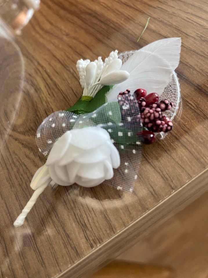 Bu bohem düğün aksesuarı, beyaz dantel, ince kumaş çiçekler ve vintage dokunuş için bir tüy içerir. Retro tarzına uygundur.