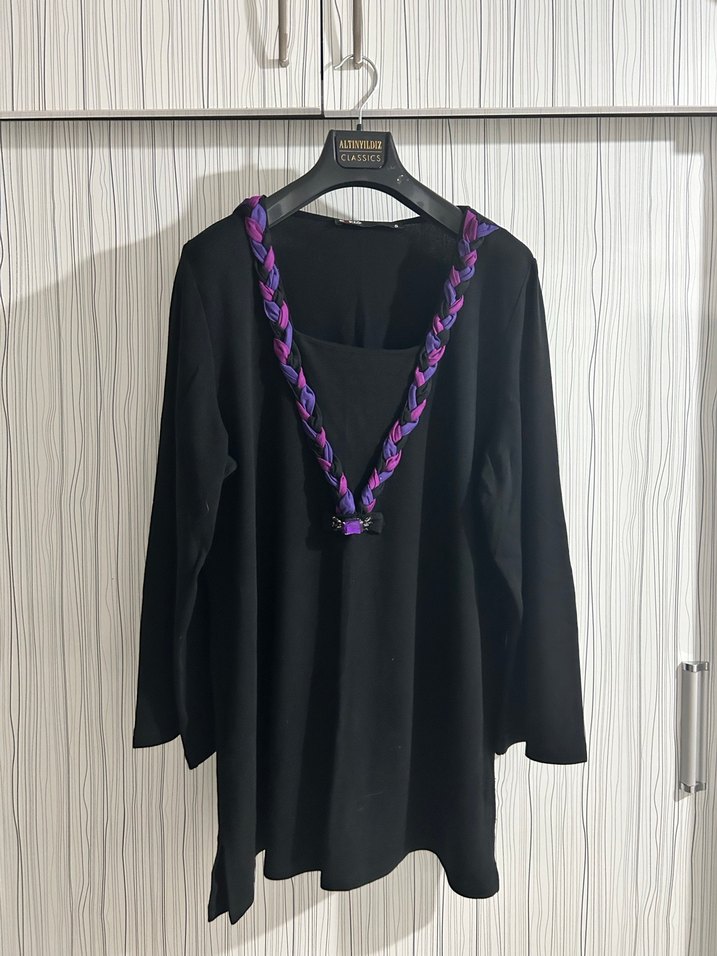 V yaka, uzun kollu, siyah triko tunik, mor örgü ve taş detaylı. Bol kesim, gotik tarzda, az kullanılmıştır.