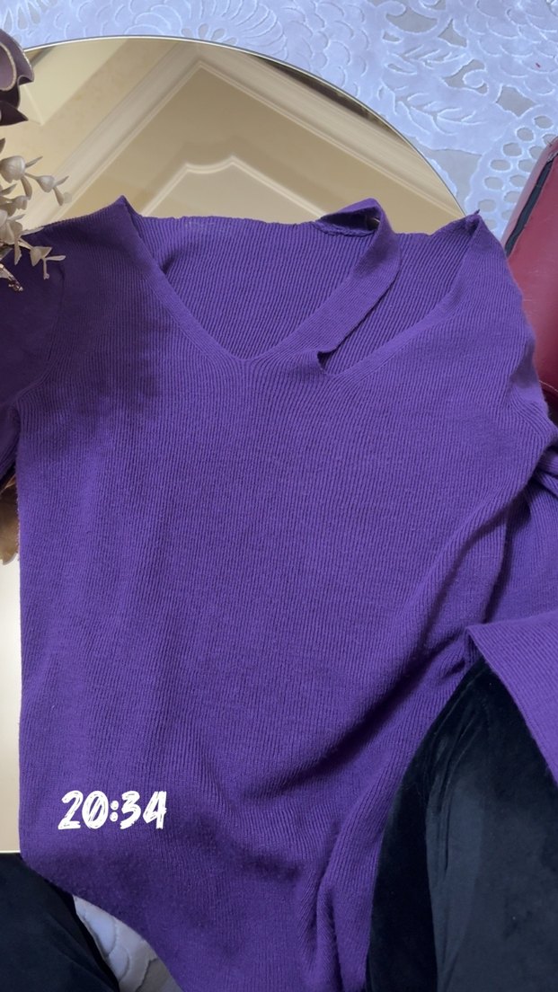 Mor renkli, V yakalı, uzun kollu, rahat kesim triko kazak. Normal boyda, desen içermeyen ve günlük kullanıma uygun sıcak bir tasarım.