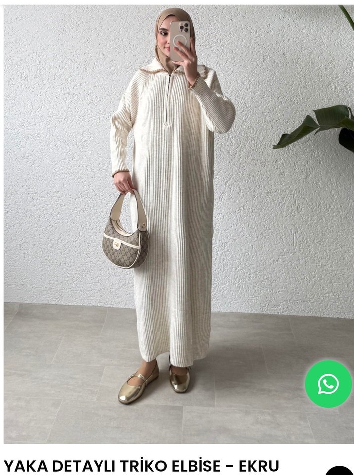 Yaka Detaylı Ekru Triko Uzun Elbise