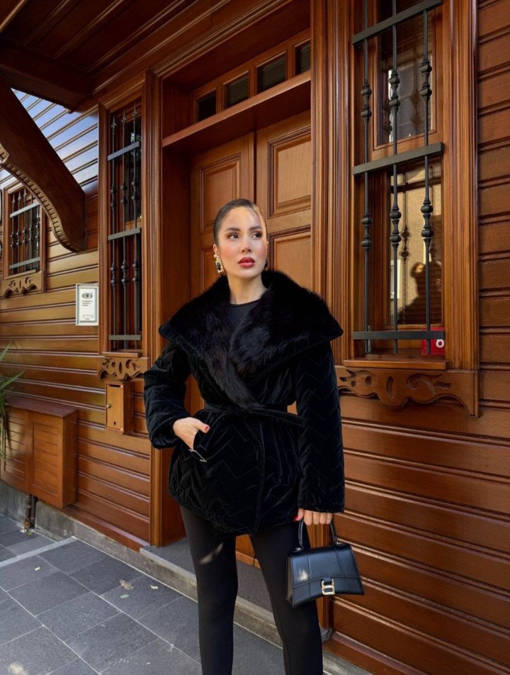 Siyah sıfır ürün mont, kürk detaylı ve uzun kolludur. Notch yakalı, regular fit olup ofis kullanımı için uygundur. Standart beden