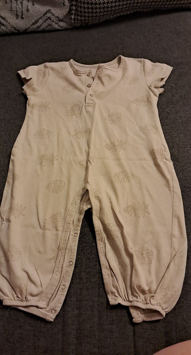 Düğmeli, bej renkli bebek tulumu, kısa kollu ve yaprak desenleriyle sade bir tasarıma sahip. Yumuşak ve rahat kumaş.