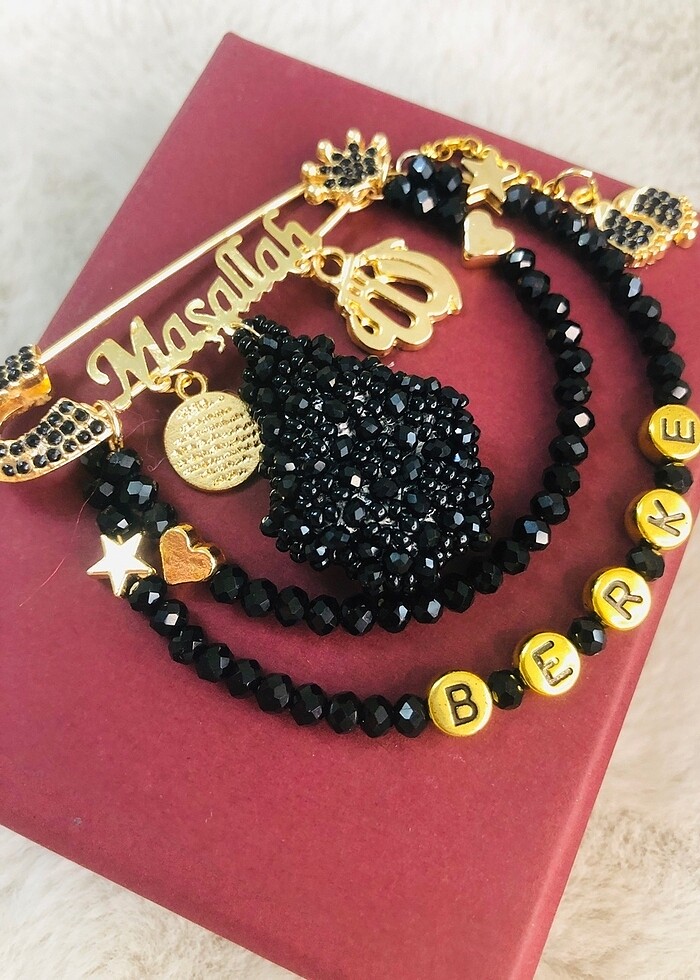 Cevşen dualı bebek yaka iğnesi istenilen renk yapılır.isteğe göre isim yazılır