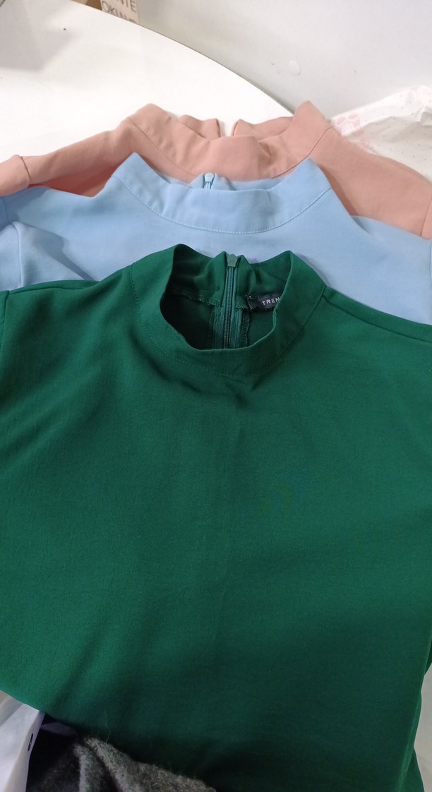 Bu bluzlar yüksek yakalı ve lastikli uzun kolludur. Düz, sentetik kumaştan yapılmış, fermuarlı ve normal uzunluktadır. Rahat günlük kullanıma uygundur.