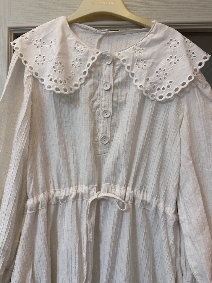 Büyük yakalı beyaz cepleri olan elbise beli ayarlanabilir ipli uzun kollu yakasında resimde göründüğü gibi hafif bir sökülme var tadilat dolayısıyla uyguna veriyorum dolabımdan iki ürün alana hediye olarak verebilirim