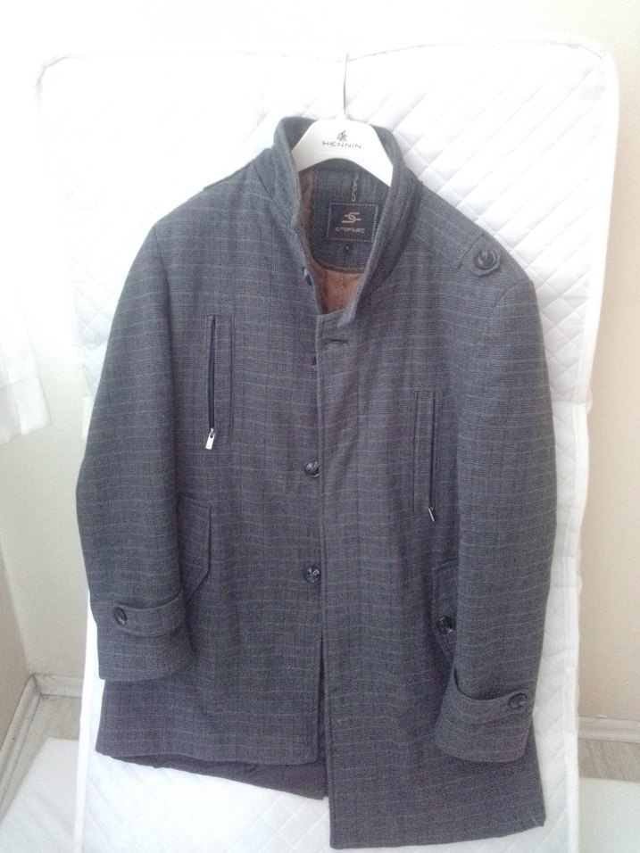 iki kol alti 48 boy 85 Düğmeli vegri renkte, uzun kollu, midi boy, yumuşak kumaştan yapılmış erkek kaban. Rahat kalıp ve çıtçıt yakaya sahiptir.
