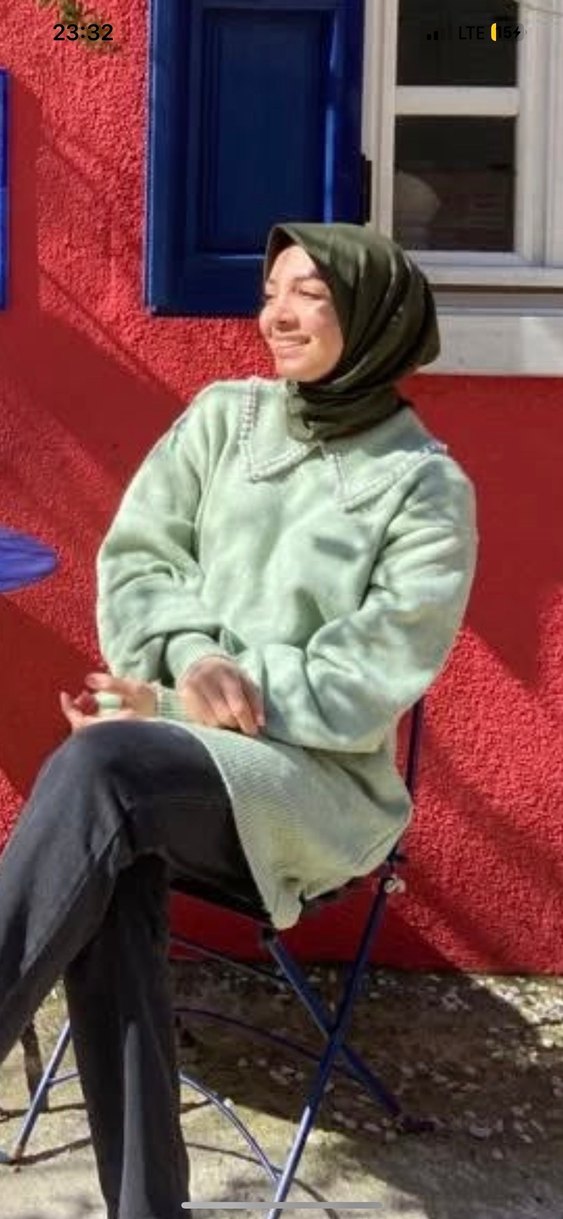 Bu haki renkli triko kadın kazak, inci detaylı yakası ve uzun kollarıyla dikkat çeker. Bol kesim ve normal boydadır, günlük rahat kullanım için uygundur. 1 defa giyildi