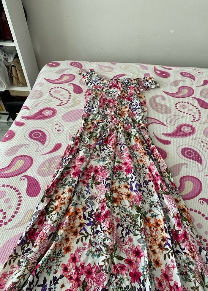 Çiçek desenli yakası fırfırlı uzun elbise S beden Hiç giyilmedi tamamen iyi durumda