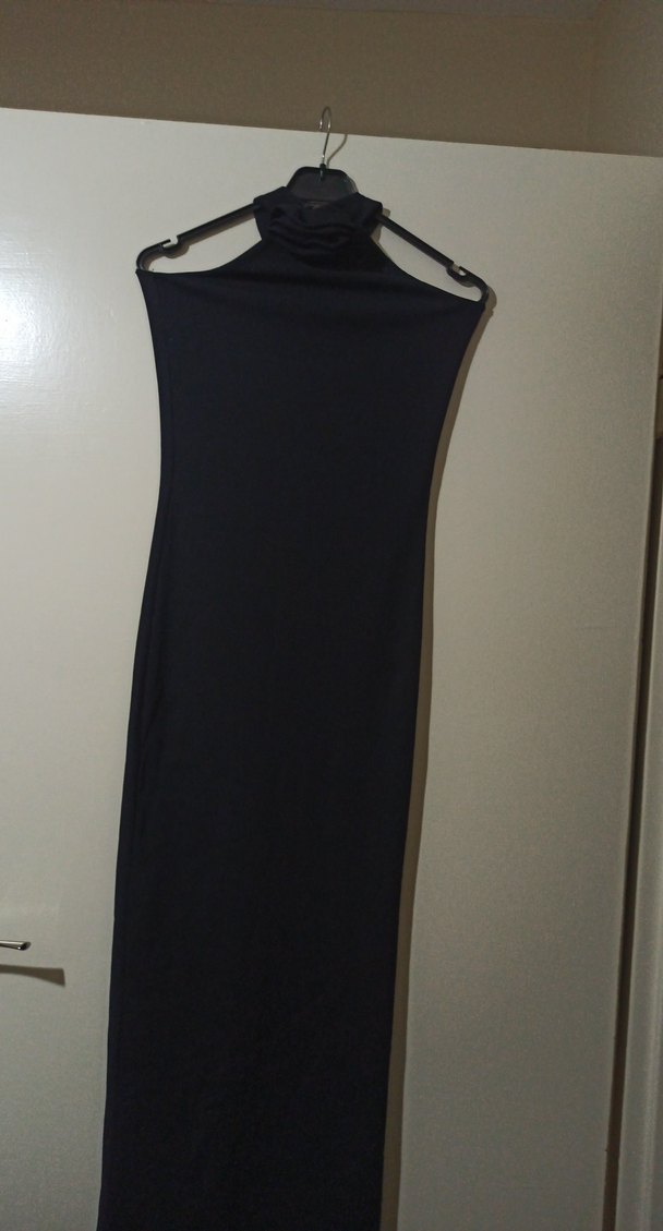 Yüksek yakalı, kolsuz, yırtmaçlı ve siyah renkli uzun elbise, rahat sentetik kumaştan Nişan düğün ı için uygundur.