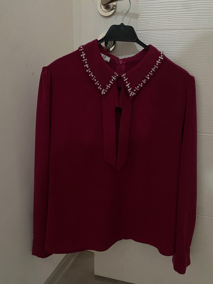Yakası inci detaylı, uzun kollu, bordo renkli, düğmeli ve bol kesim kadın gömlek. İpeksi dokusu ve parlak yüzeyiyle dikkat çeker.