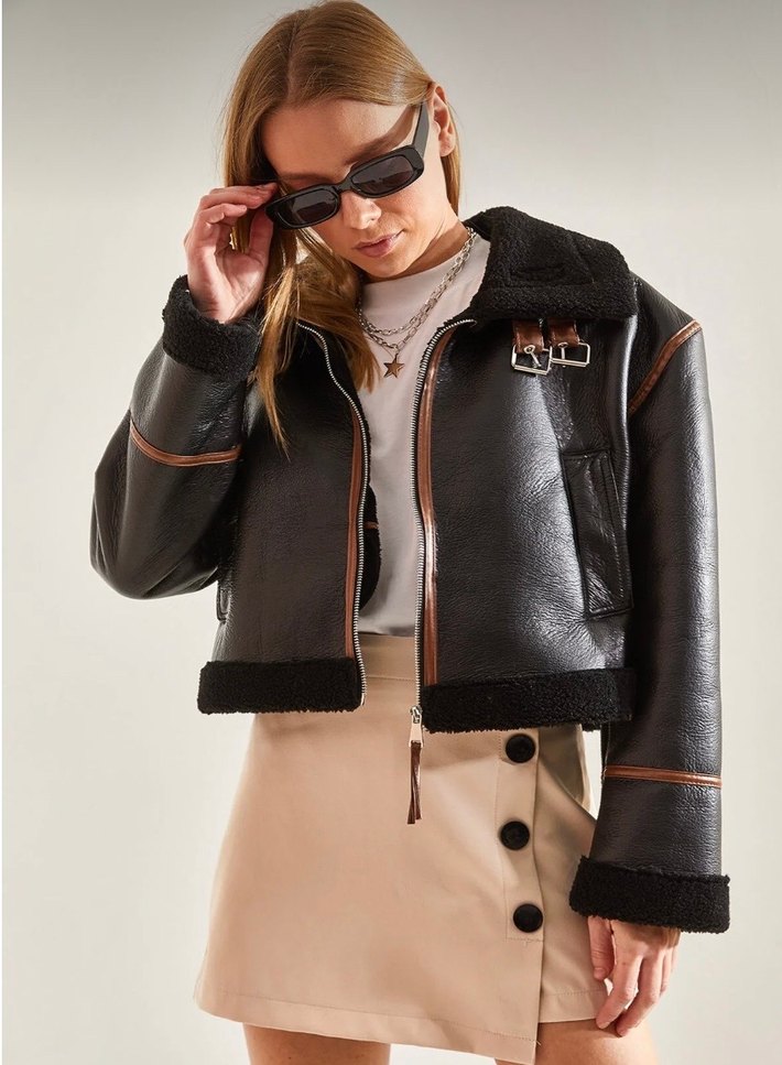 Kürklü detaylara sahip siyah deri ceket, kısa ve bol kesimdir. Notlu yaka ve uzun kolludur, günlük kullanıma uygundur. Etiketli