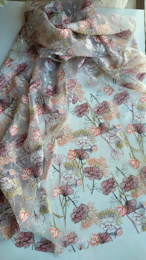 Yakma keten tül kumaş.Transparan, tok ve dik duruşlu bir tül üzerinde çiçek desenleri.Harika kabarık etek ,elbise, bluz tasarımları olur.Ünlü bir markanın kumaşı.Eni 140 cm , boyu 175 cm. Tamamının fiyatıdır.(Adı yakma keten kumaş ama doğal keten değil, sentetiktir)