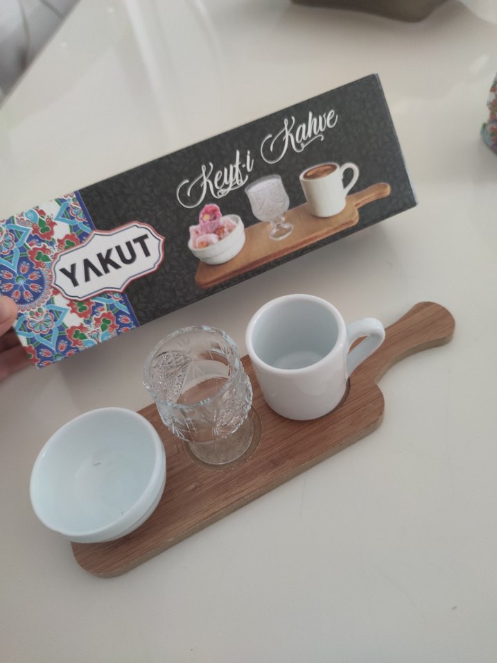 Beyaz kahve fincanı, cam ve kaseyi içeren, ahşap tepside sunulan geleneksel Türk kahvesi seti. ☕ adet fiyatı