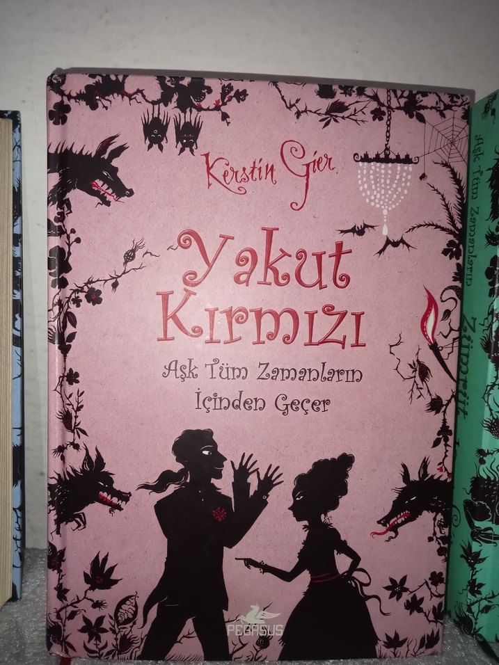 Kerstin Gier'in 'Yakut Kırmızı' adlı romanı, aşkın tüm zamanlardan geçtiğini anlatıyor. Pembe kapak, silüetler ve fantastik öğeler içeriyor.