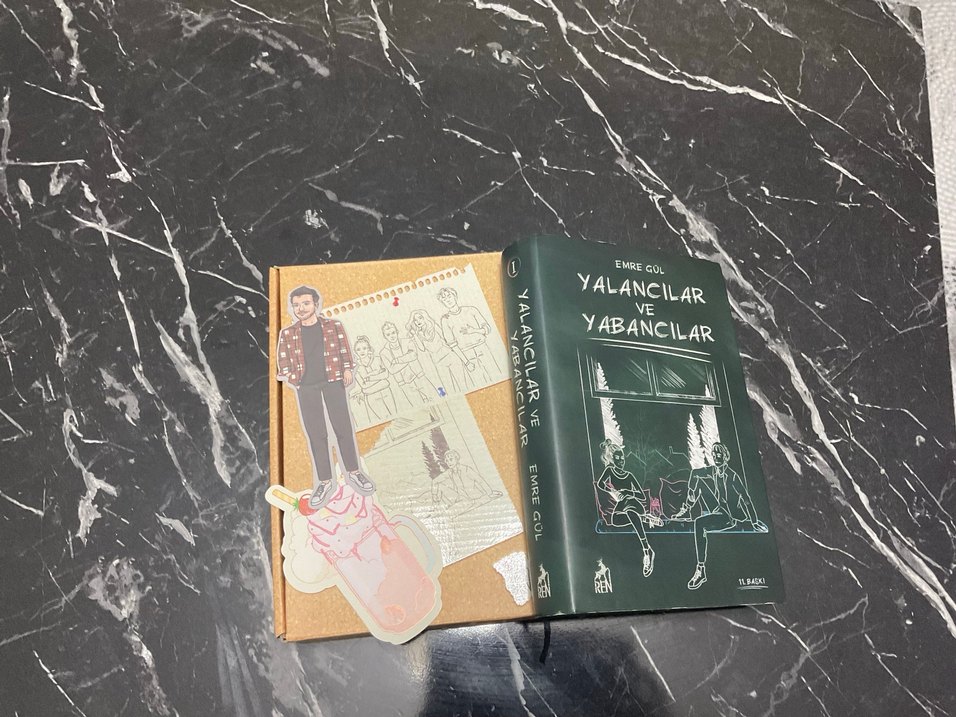 Emre Göl'ün "Yalancılar ve Yabancılar" romanı, çizimli kapak ve yanında sanatsal ayraçlar ve çizimler içerir.