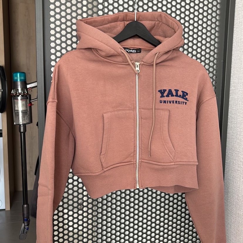 Bej renkli, fermuarlı ve uzun kollu, kısa kesim sweatshirt. V yaka ve Yale Üniversitesi baskılı, rahat kesim, sıcak ve yumuşak kumaştan üretilmiştir.