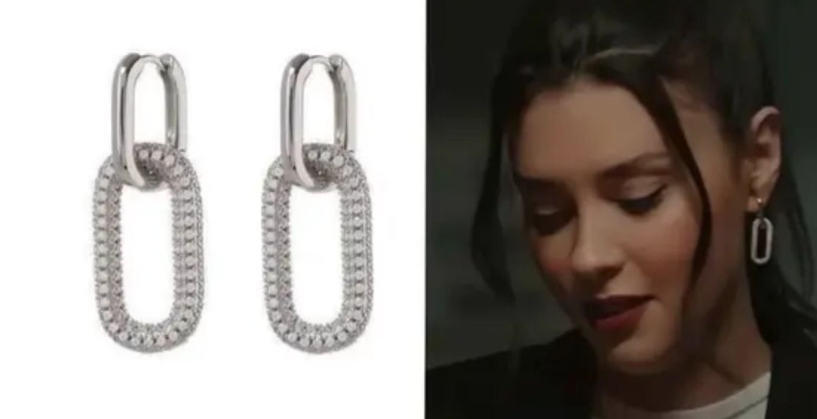Gri renkte, zincir detaylı midi uzunlukta kadın küpeleri. Minimalist tasarımıyla günlük sokak stiline uygundur.