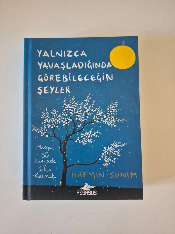 Pegasus yayınevinden Haemin Sunim'in "Yalnızca Yavaşladığında Görebileceğin Şeyler" adlı şiir kitabı. Mavi kapakta sarı ay ve beyaz çiçekli ağaç bulunuyor.