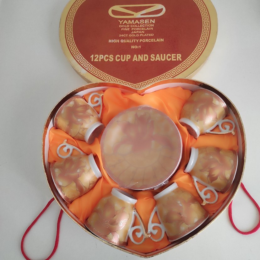Yamasen'in 24 ayar altın kaplama, parlak altın renkli 12 parçalık kaliteli porselen fincan ve tabağı kalp şeklinde kutuda.
