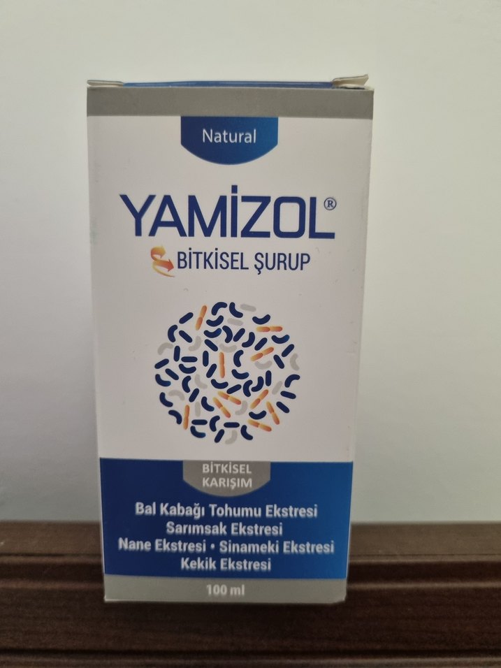 Yamizol 100ml bitkisel şurup, bal kabağı tohumu, sarımsak, nane, sinameki ve kekik ekstreleri içerir. Az kullanılmış.