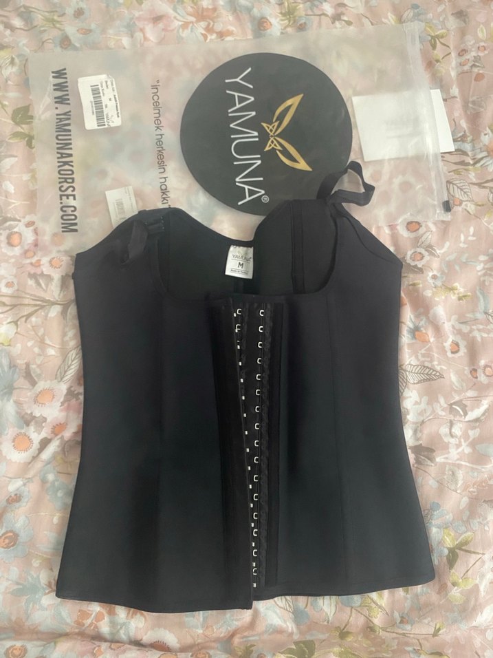 Yamuna markasına ait siyah, midi uzunlukta, önden çıtçıtlı hemşire korsesi, destek ve şekillendirme sağlar.