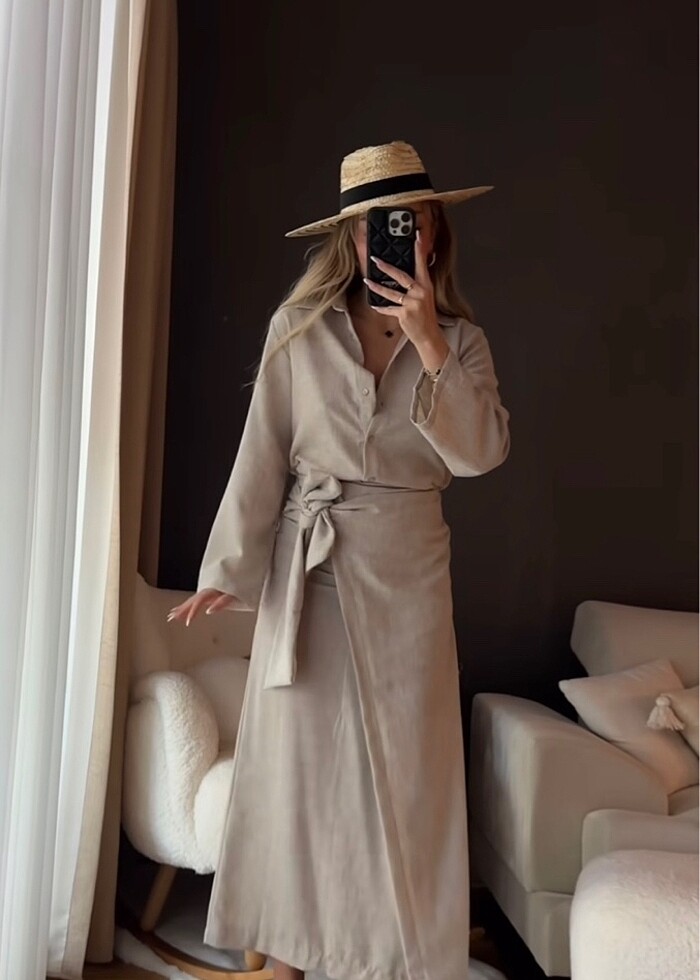 L beden 38-40 bedene uygun Bej Yüzde yüz keten yandan bağlamalı etek Arkada fermuarı mevcut Gömlekte aynı renk aynı kumaş takım Hiç giyilmedi etiketiyle gelecektir bol olduğu için satıyorum Onze butikten alındı Detaylı görsel isteyenler mesaj atabilir