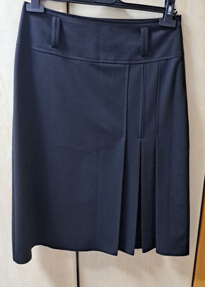 Yandan pileli sadece bir kez kullanıldı. Çok temiz. Belden etek ucuna kadar 66 cm bel ölçüsü 43 cm.