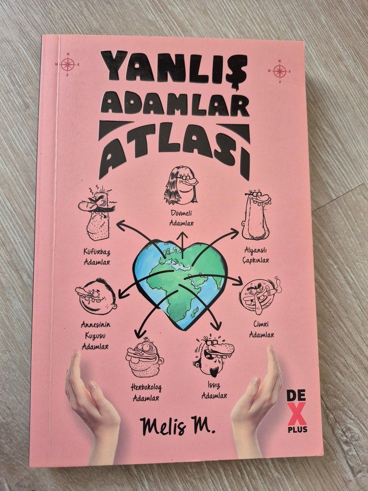 Melis M.'nin yazdığı "Yanlış Adamlar Atlası" adlı sağlık kitabı, kapakta çizimli ve kalp merkezli dünya haritası içeriyor.
