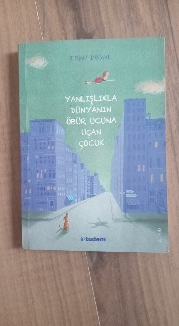 John Boyne'un yazdığı, Tudem'den yayınlanan "Yanlışlıkla Dünyanın Öbür Ucuna Uçan Çocuk" adlı hikaye kitabı, şehir manzarası üzerinde uçan bir çocuk resmiyle kaplanmıştır.