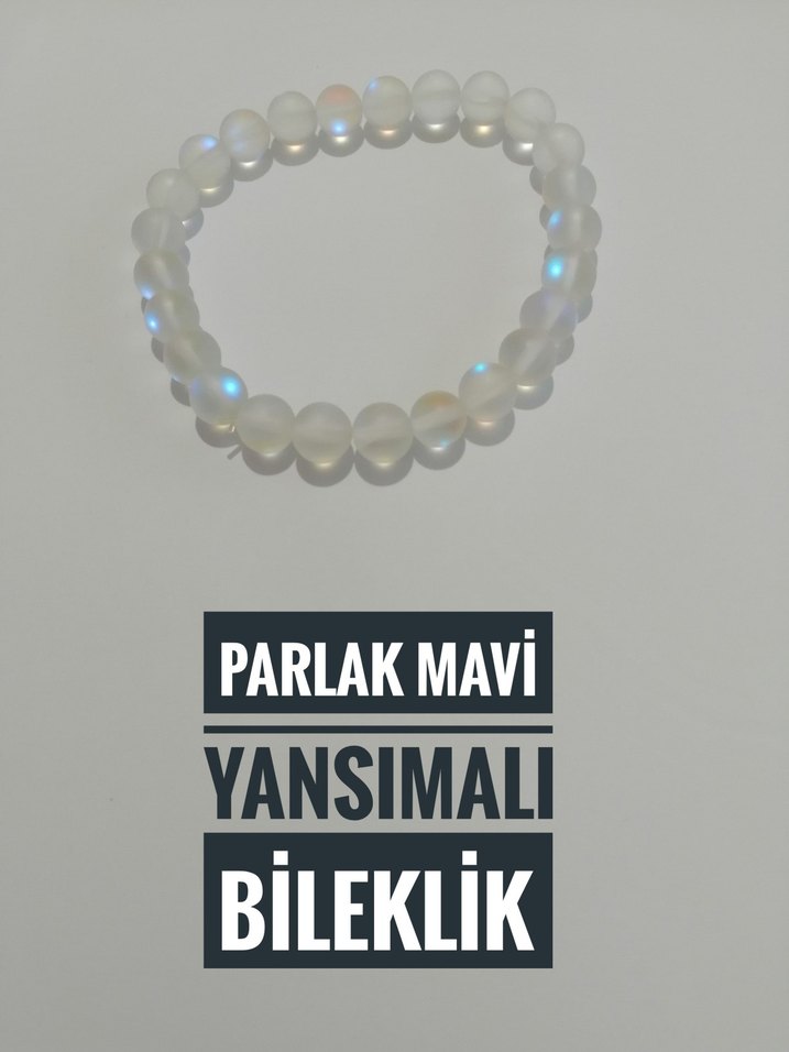 Beyaz boncuklardan bileklik hafif parlak mavi yansıma detaylarıyla minimalist ve bohem tarz sunar. Mat ve yansıtıcı yüzeye sahiptir. ✨