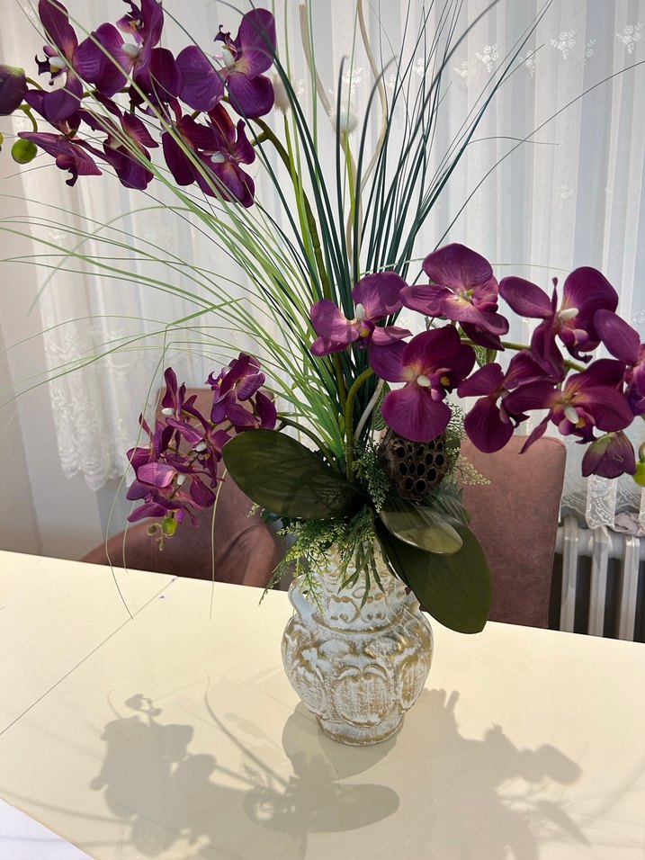 Mor orkide çiçekleri ve yeşil yapraklarla süslenmiş dekoratif vazo, ev dekorasyonuna doğal bir dokunuş katıyor .