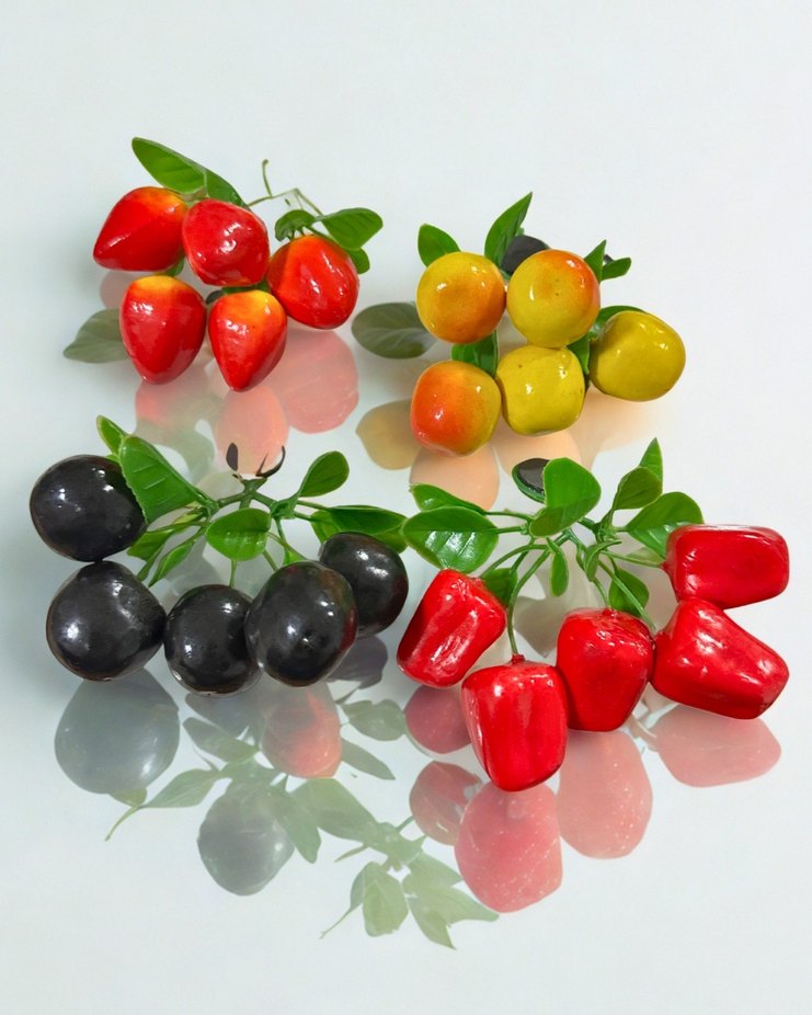 Kırmızı, sarı ve siyah meyveler ile yeşil yapraklardan oluşan renkli meyve figürleri seti. Canlı ve dekoratif ürünler.