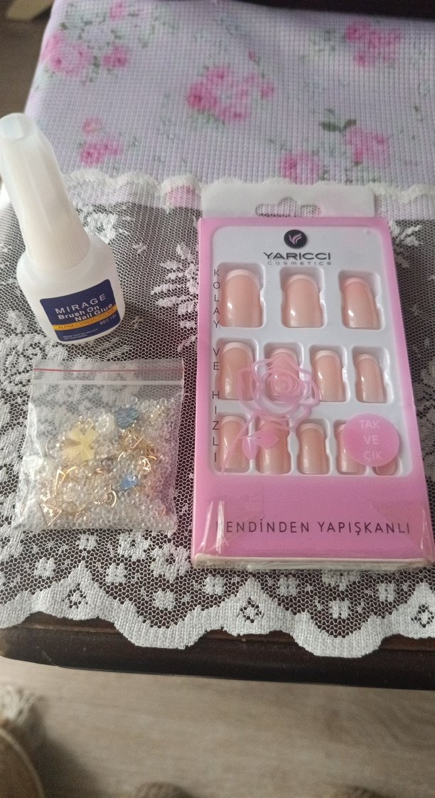 Pastel pembe renkte, çiçek ve taş süslemeli yapışkanlı takma tırnaklar ve kolay uygulama için tırnak yapıştırıcısı içerir. bir kere takmayı denedim beceremedim sıfır ürün