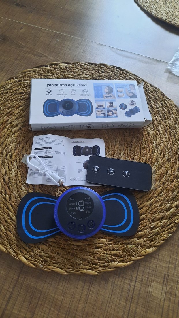 Ayarlanabilir yoğunluk ve '18' dijital ekran gösterimi bulunan koyu mavi yapıştırma ağrı kesici. Kumanda ve USB şarj kablosu dahil.