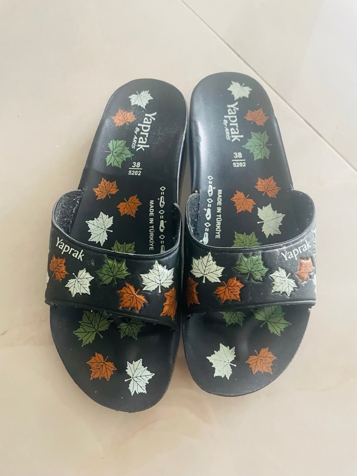 Koyu taban üzerinde çok renkli yaprak desenli, tokalı bantlı, platform topuklu kauçuk kadın terlikler. Evde kullanıldı sadece . Çok rahattır tam kalıptır kendi numaranızı tercih ediniz