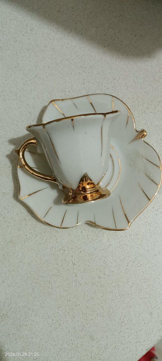 Yaprak şekilli beyaz porselen fincan ve tabağın kulp ve kenarlarında altın detaylar bulunur. incecik bir porselen #fincan #porselenfincan