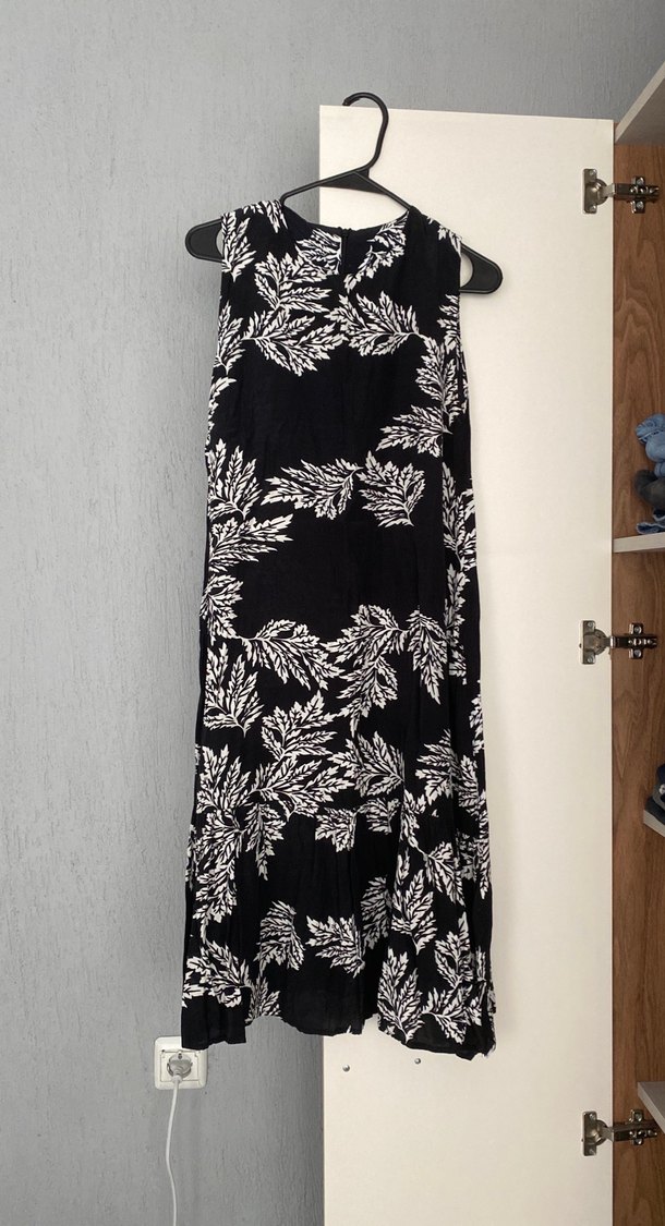 Yaprak desenli siyah elbise, kolsuz ve yüksek yakalıdır. Rahat kesimi ve piliseli detaylarıyla yumuşak sentetik kumaştan üretilmiştir. Günlük kullanım için bohem tarzda.