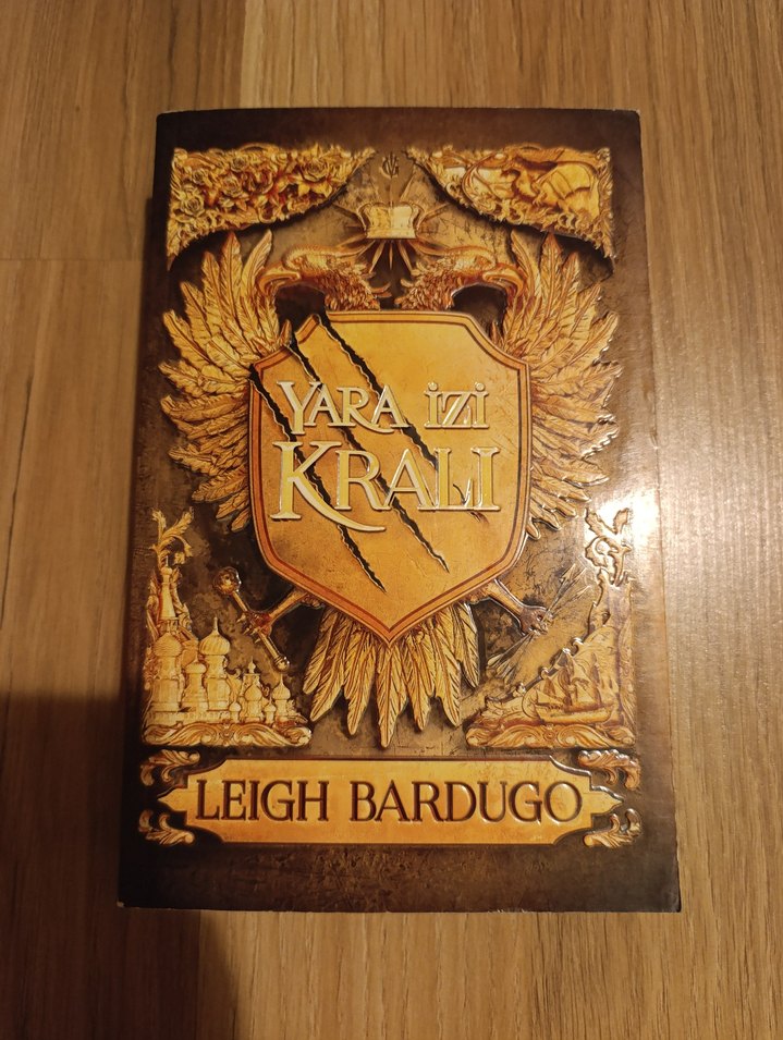 Leigh Bardugo'nun "Yara İzi Kralı" adlı romanı, ayrıntılı altın bir amblem ve detaylı tasarıma sahip kapağıyla dikkat çekiyor. yan kısmında ve alt kısmında biraz aşınma var ama okunması herhangi bir sayfası çizilmemiştir