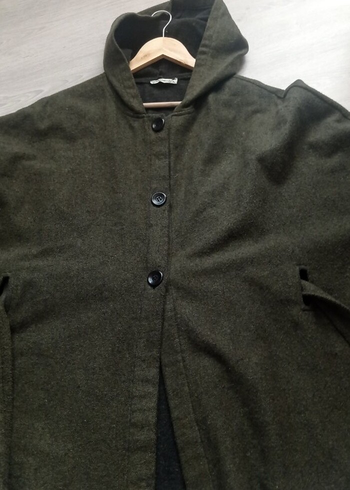 Haki yeşil yarasa kol kapşonlu bayan pelerin ince manto mevsimlik beli kuşaklı xl beden ölçüleri fotoğrafda mevcut sayılı giyildi yepyeni denilebilir